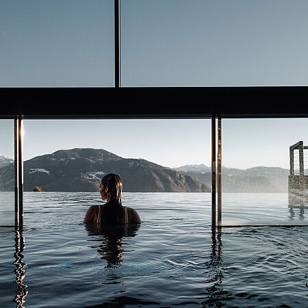 Vom Bozner Talkessel bis zu den Felsgiganten der Dolomiten: Aus beinahe jedem Winkel des Hideaway-Hotels in Südtirol erblicken Sie Weite, ob im Pool, in der Sauna, im Restaurant oder Zimmer.
