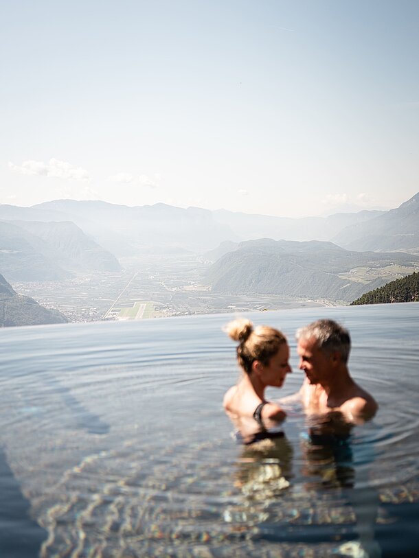 If you're looking for a hotel with an infinity pool near the Dolomites, the Belvedere Hotel will not only meet your expectations but will truly captivate you. Situated at 1,100 meters above sea level, far from the hustle and bustle of daily life, architecture and nature merge in a unique way. And there’s no better place to experience this than in the three pools of the hotel. Would you like to dive into one of the most spectacular infinity pools South Tyrol has to offer? Relax in the whirlpool with a majestic view of the Dolomites? Or are you looking for a hotel with a natural swimming pond? Immerse yourself in the diverse water world of the Belvedere!
