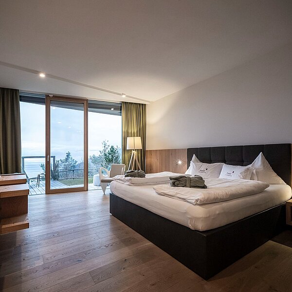 Clean lines, frameless floor-to-ceiling windows, fine wooden floors and handpicked materials define the architectural clarity of this hillside Junior Suite – honoured with the best architects award. A striking modern bathroom, in some cases en-suite, adds a bold interior accent, while the spacious 2x2 m sommier bed invites you to linger in a space where openness meets warmth.