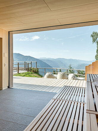 A new outdoor sauna has been created in the extension of the pool with views of the capital of South Tyrol. Here you can find your inner balance and let the outside panorama works its magic. Infusion rituals round off the experience in this sauna above Bolzano.